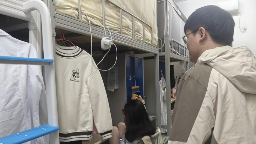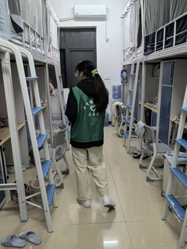 志愿者在朱浩鹏老师的带领下有序开展查寝工作。检查过程中,朱老师针对发现的细节问题逐项引导规范:看到同学床上放置排插,便提醒大家离开宿舍时务必切断排插电源,从源头规避安全隐患;发现宿舍垃圾堆积,便叮嘱及时清理,防止蚊虫滋生影响居住环境。