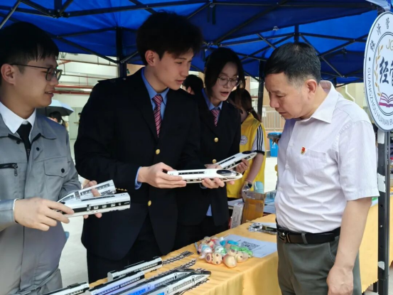 城市轨道交通运营管理知识大赛摊位以"虚实结合"的交互设计惊艳全场,现场不仅有1:20精密还原的CR400BF复兴号与CRH380A和谐号动态模型构成展区核心,还有身着制服的同学进行专业讲解,让师生们仿若置身列车内部探索构造。此比赛项目将结合模型与AR技术进行出题,如模拟故障排查等。同学们从中切身体会到科技与学术的深度融合,也充分激发了探索城轨领域的热情。