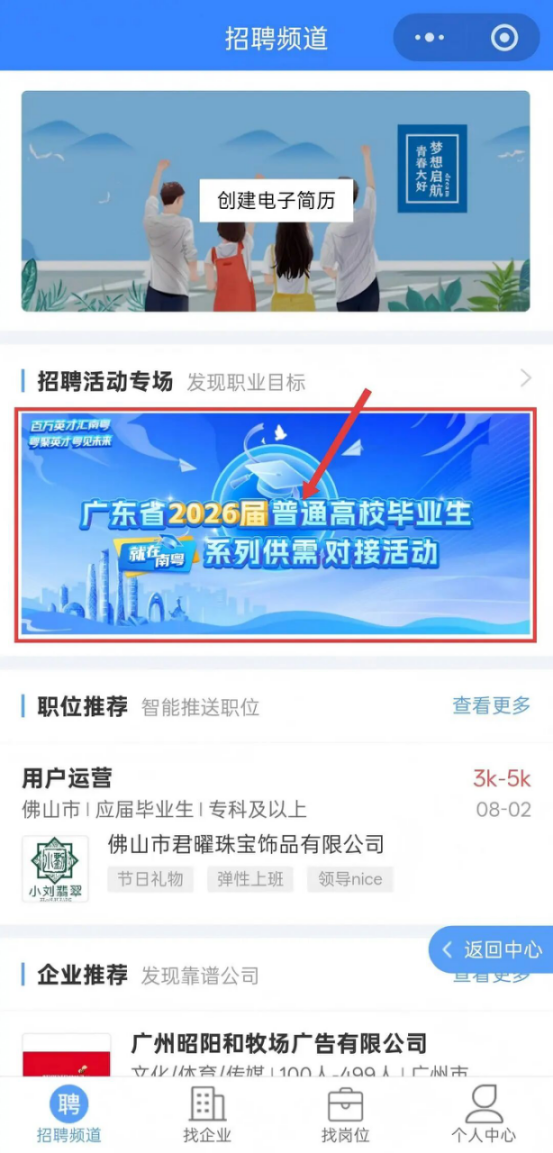 在招聘频道内,找到并点击「广东省2026届普通高校毕业生“就在南粤”系列供需对接活动」,进入活动专场。