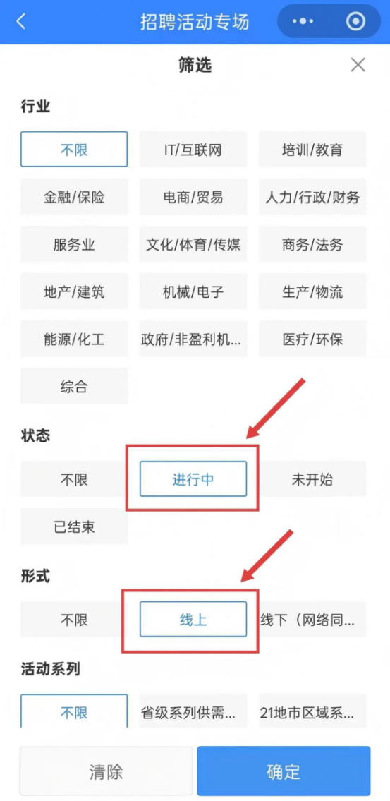 进入活动页面后,点击“筛选”功能,在筛选条件中同时勾选“进行中”和“线上”,精准定位可参与的线上招聘会。