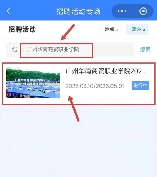在页面顶部搜索栏中,输入“广州华南商贸职业学院”,点击搜索,即可找到「华南商贸网上招聘会」。
